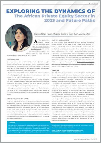 Exploring the Dynamics of the African Private Equity Sector 30/06/2024 In this interview, Shamima Mallam-Hassam, Managing Director of our Mauritius office, discusses Africa's market resilience amid global challenges and how first-time fund managers excelled in 2023. She sees a promising future with continued innovation, investor confidence, and interest in renewable energy and venture capital. Click on the image below to read the insight. X Linkedin Messenger More Funds News Trident Trust Expands Service Offering to Spain 31/05/2023 Introduction of the Financial Services (Global Shared Services) Rules 2022 09/05/2023 Meet Our Team at GAIM Ops in Grand Cayman 17/04/2023 Latest News Trident Trust Expands Service Offering to Spain Introduction of the Financial Services (Global Shared Services) Rules 2022 Meet Our Team at GAIM Ops in Grand Cayman Introduction of UAE Corporate Income Tax Trident Trust Extends US Fund Services Footprint to Texas UK Register of Overseas Entities, Deadline Approaching!